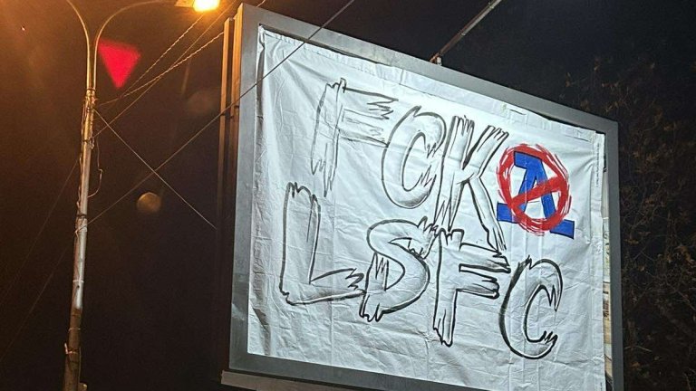 Часове преди дербито между Левски и ЦСКА, фенове на „червените“ сложиха на билбордове из столицата плакати в подкрепа на любимия отбор и срещу „сините“.